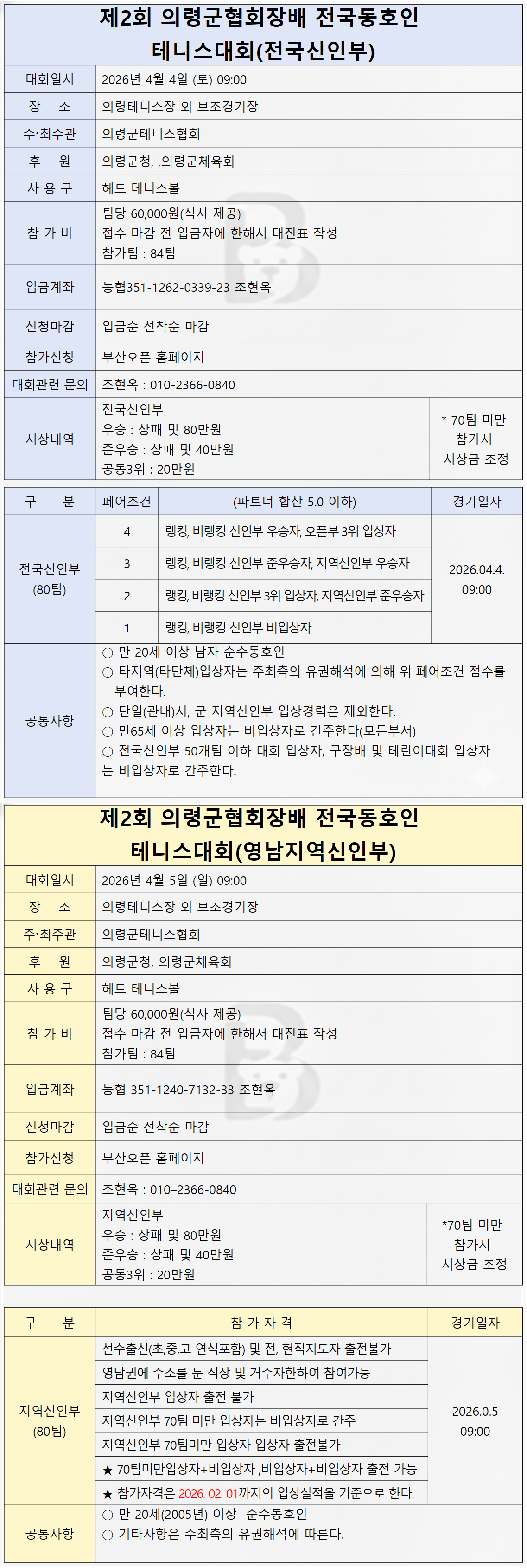 Á¦2ȸ ÀǷɱºÇùȸÀå¹è Àü±¹µ¿È£ÀÎ Å״Ͻº´ëȸ(Àü±¹½ÅÀκÎ/Áö¿ª½ÅÀκÎ) - 4/4(Åä),4/5(ÀÏ)[0]