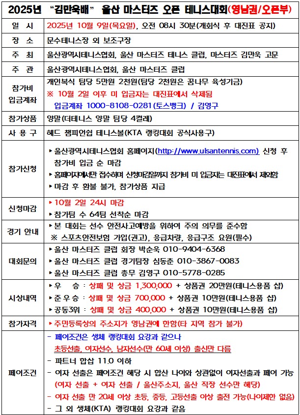 2025³â "±è¸¸¿í¹è" ¿ï»ê ¸¶½ºÅÍÁî ¿ÀÇ Å״Ͻº´ëȸ(¿µ³²±Ç/¿ÀǺÎ) - 10/9(¸ñ)