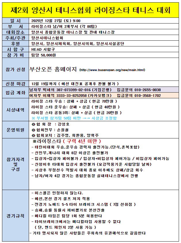 Á¦2ȸ ¾ç»ê½Ã Å״ϽºÇùȸ ¶óÀÌ¡½ºÅ¸ Å״Ͻº ´ëȸ - 12/27(Åä)